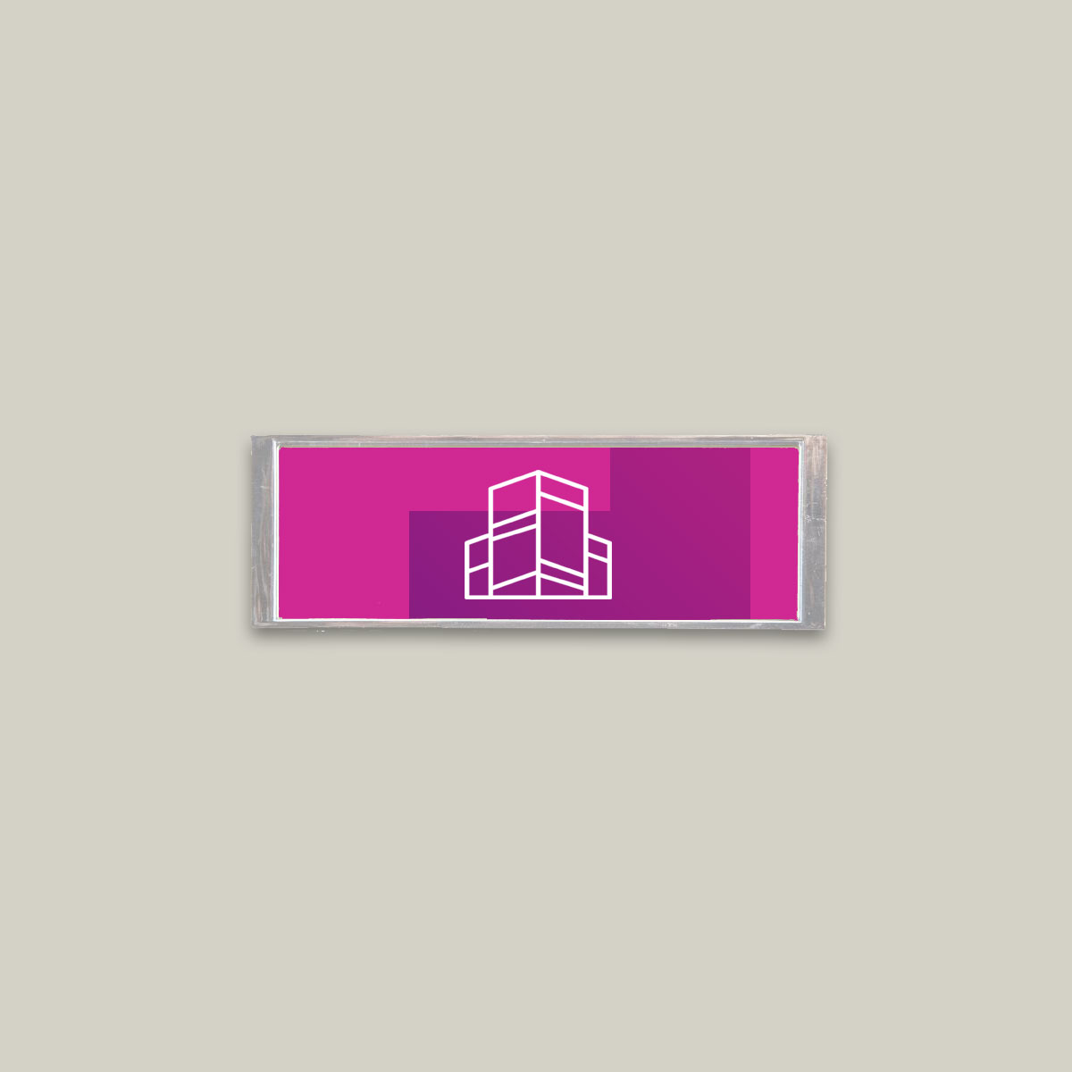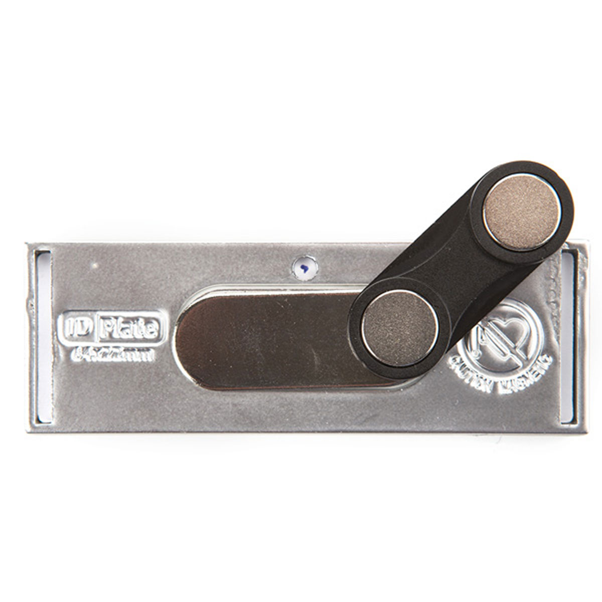 Crachá de identificação com íman para fixação. Formato retangular 65x20mm.